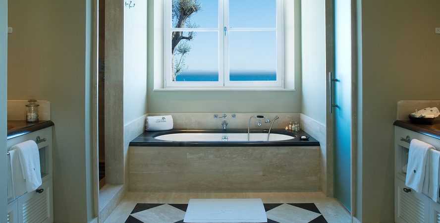 Cortesin Suites: je největším pokoje v hotelu 180m2, dvě luxusní ložnice, prostorný obývací pokoj s pohodlnou trojsedačkou. Prostorná terasa s překrásným výhledem na moře.